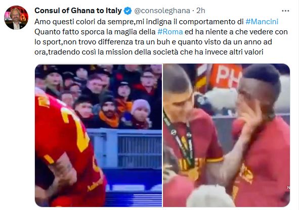 “Amo questi colori da sempre – ha scritto il console -, mi indigna il comportamento di Mancini. Quanto fatto sporca la maglia della Roma e ha niente a che vedere con lo sport, non trovo differenza tra un buh e quanto visto da un anno ad ora, tradendo così la mission della società che ha invece altri valori. Mi sento indignato sia come ghanese che come tifoso della Roma, tradito da un singolo giocatore che non rappresenta gli alti valori di rispetto che ha la società e su cui ha sempre investito. Forza Roma”.